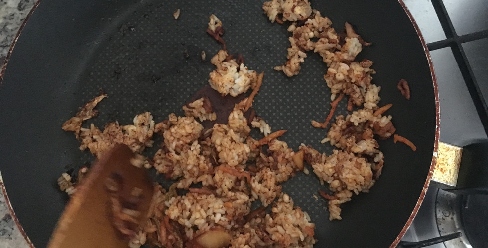 4. Mix in soy sauce and the sesame oil (that's why it looks a bit burnt in the photo!)